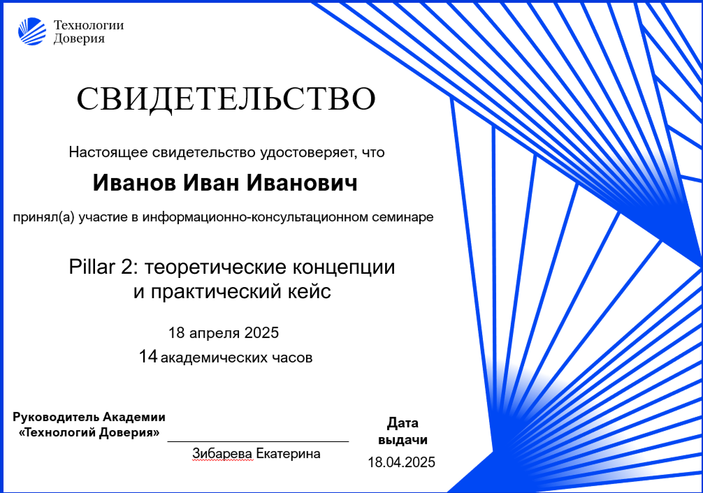 Cлушателям выдается свидетельство об участии в семинаре «Pillar 2: теоретические концепции и практический кейс»
