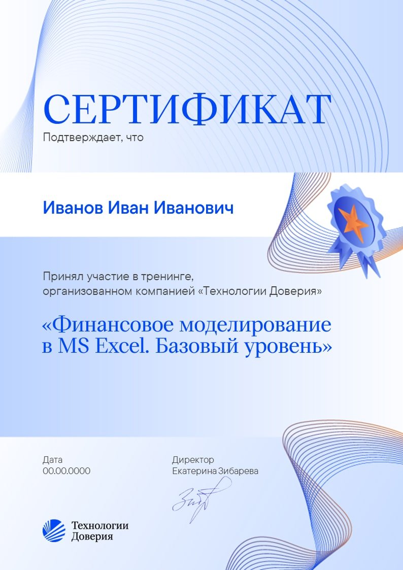 По окончании онлайн-курса выдаётся электронное свидетельство об участии в семинаре «Финансовое моделирование в MS Excel».