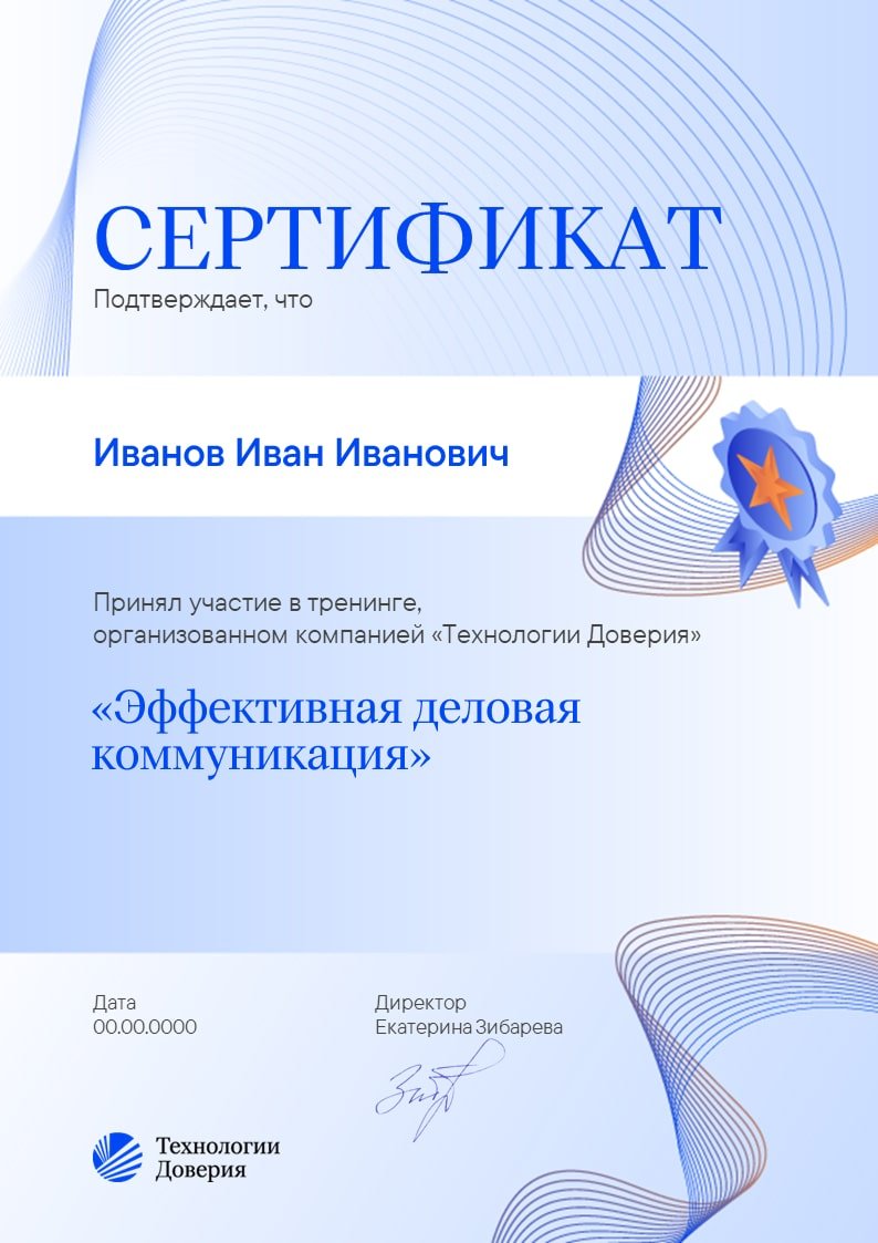 Слушателям выдаётся свидетельство об участии в семинаре «Эффективная деловая коммуникация», а также при необходимости сертификат, подтверждающий количество CPD-часов.