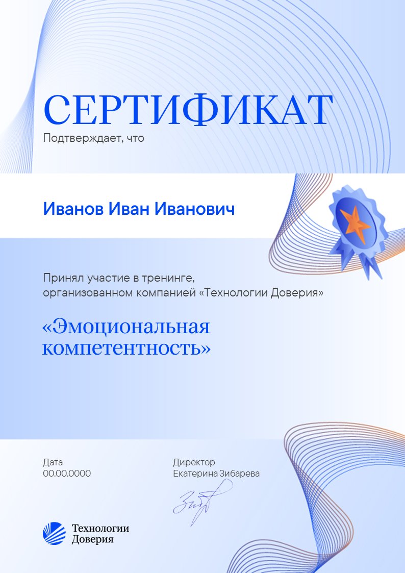 Слушателям выдаётся свидетельство об участии в семинаре «Эмоциональная компетентность», а также при необходимости сертификат, подтверждающий количество CPD-часов.