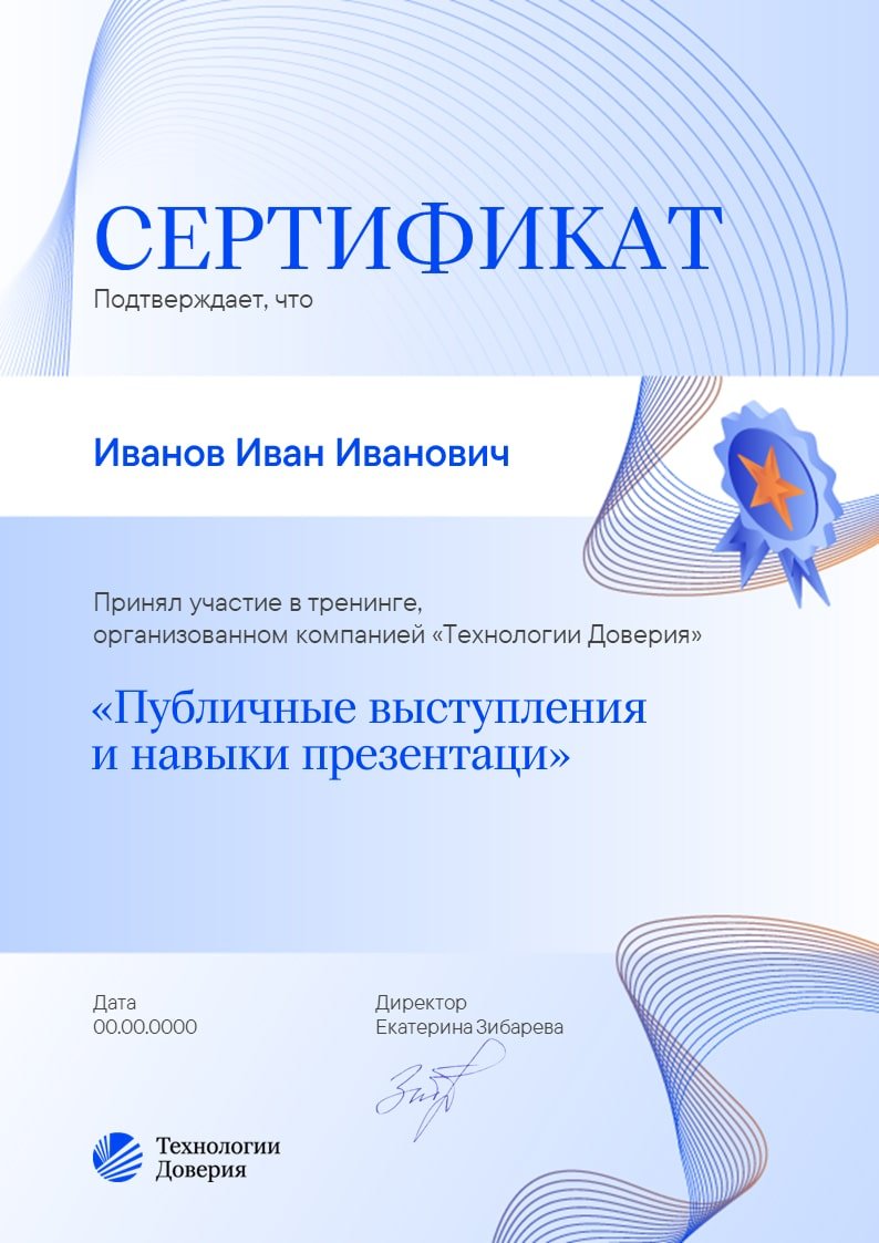 Слушателям выдаётся свидетельство об участии в семинаре «Публичные выступления и навыки презентации», а также при необходимости сертификат, подтверждающий количество CPD-часов.
